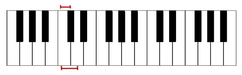 In quest’immagine puoi vedere che la distanza che c’è tra Do e Do# è la distanza più piccola che possa esserci tra due tasti. In poche parole, se prendo il tasto Do del pianoforte e ti chiedo di toccare il tasto immediatamente a destra del Do non prenderesti il Re, ma bensì il Do# perché questo è effettivamente quello più vicino al Do.
